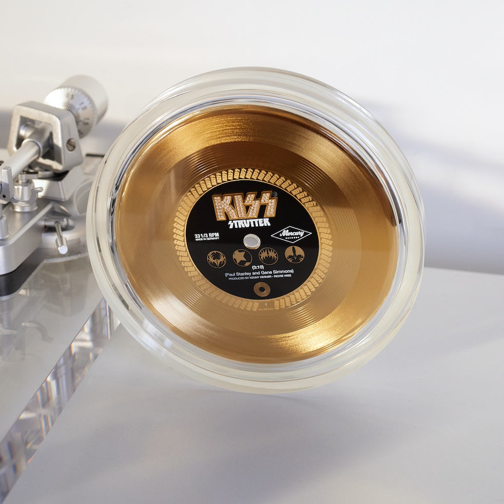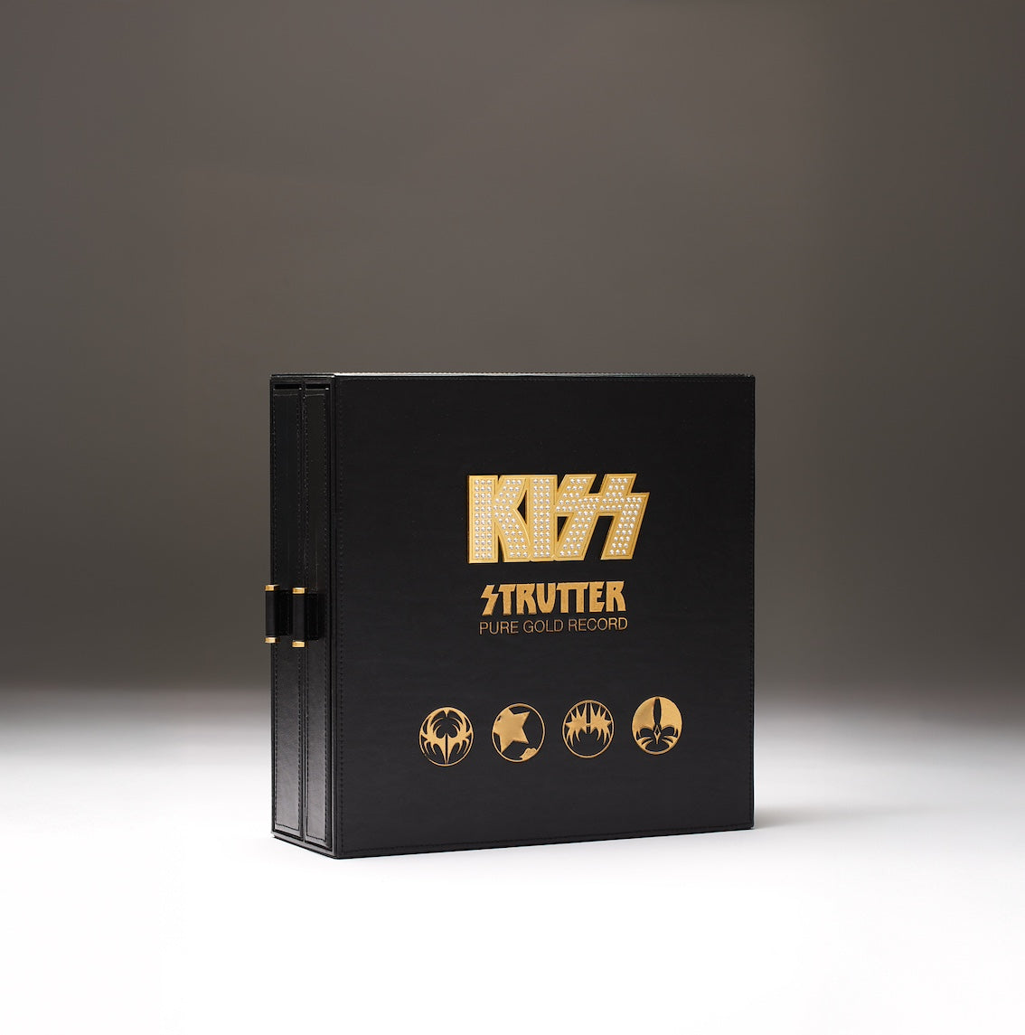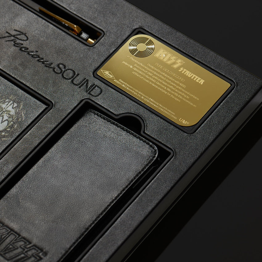 Each record comes in a imitation leather coffee table display box with the KISS logo showcased in Swarvoski crystals, exquisite gold foil details and two drawers, one housing the 24-karat pure gold record in a protective sapphire crystal glass capsule, and the other containing a signed book on STRUTTER, the gold-detailed pen used to sign the book, an exclusive letter from Gene Simmons, and additional accessories, such as a laser-engraved metal certificate of authenticity, a premium cork record mat, and a microfiber cleaning cloth.