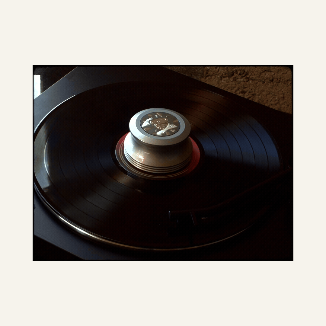 To enhance your listening experience, place the record stabilizer atop your records at the center of the turntable before hitting play.
